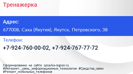 Тренажерка по адресу 677008, Саха (Якутия), Якутск, Петровского, 38 в дальнейшем Организация, размещена в следующих категориях: