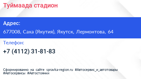 Туймаада, стадион по адресу 677008, Саха (Якутия), Якутск, Лермонтова, 64 в дальнейшем Организация, размещена в следующих категориях: