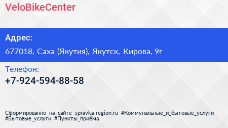 VeloBikeCenter по адресу 677018, Саха (Якутия), Якутск, Кирова, 9г в дальнейшем Организация, размещена в следующих категориях: