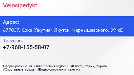 Velosipedykt по адресу 677007, Саха (Якутия), Якутск, Чернышевского, 99 кЕ в дальнейшем Организация, размещена в следующих категориях: