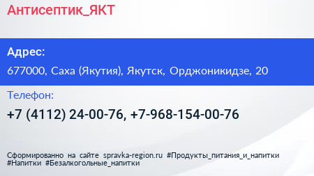 Антисептик_ЯКТ по адресу 677000, Саха (Якутия), Якутск, Орджоникидзе, 20 в дальнейшем Организация, размещена в следующих категориях: