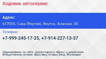 Ходовик, автосервис по адресу 677014, Саха (Якутия), Якутск, Аласная, 30 в дальнейшем Организация, размещена в следующих категориях: