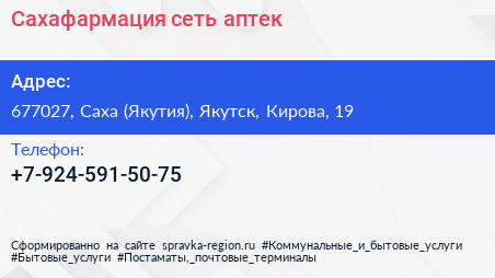 Сахафармация, сеть аптек по адресу 677027, Саха (Якутия), Якутск, Кирова, 19 в дальнейшем Организация, размещена в следующих категориях: