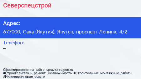 Северспецстрой по адресу 677000, Саха (Якутия), Якутск, проспект Ленина, 4/2 в дальнейшем Организация, размещена в следующих категориях: