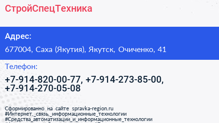 СтройСпецТехника по адресу 677004, Саха (Якутия), Якутск, Очиченко, 41 в дальнейшем Организация, размещена в следующих категориях: