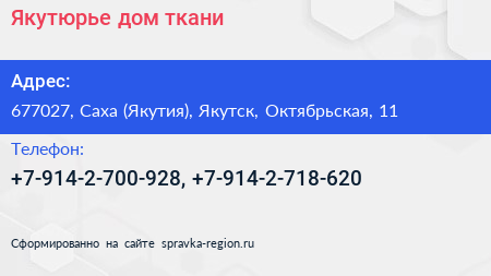 Якутюрье, дом ткани по адресу 677027, Саха (Якутия), Якутск, Октябрьская, 11 в дальнейшем Организация, размещена в следующих категориях: