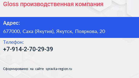 Gloss, производственная компания по адресу 677000, Саха (Якутия), Якутск, Пояркова, 20 в дальнейшем Организация, размещена в следующих категориях: