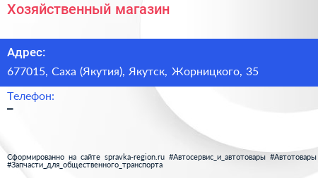 Хозяйственный магазин по адресу 677015, Саха (Якутия), Якутск, Жорницкого, 35 в дальнейшем Организация, размещена в следующих категориях: