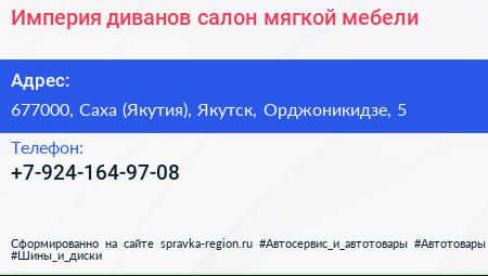 Империя диванов, салон мягкой мебели по адресу 677000, Саха (Якутия), Якутск, Орджоникидзе, 5 в дальнейшем Организация, размещена в следующих категориях: