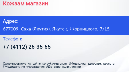 Кожзам, магазин по адресу 677009, Саха (Якутия), Якутск, Жорницкого, 7/15 в дальнейшем Организация, размещена в следующих категориях:
