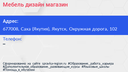 Мебель-дизайн, магазин по адресу 677008, Саха (Якутия), Якутск, Окружная дорога, 102 в дальнейшем Организация, размещена в следующих категориях: