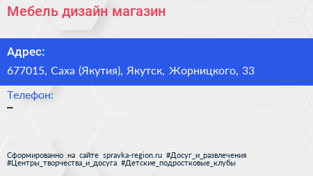 Мебель-дизайн, магазин по адресу 677015, Саха (Якутия), Якутск, Жорницкого, 33 в дальнейшем Организация, размещена в следующих категориях: