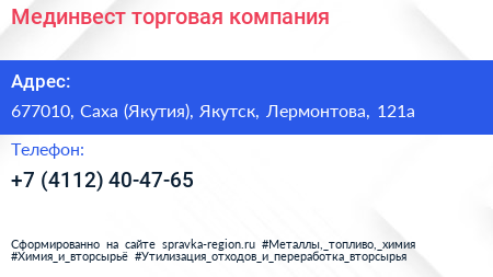 Мединвест, торговая компания по адресу 677010, Саха (Якутия), Якутск, Лермонтова, 121а в дальнейшем Организация, размещена в следующих категориях: