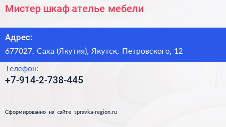 Мистер шкаф, ателье мебели по адресу 677027, Саха (Якутия), Якутск, Петровского, 12 в дальнейшем Организация, размещена в следующих категориях: