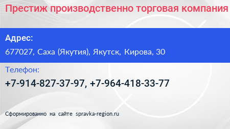 Престиж, производственно-торговая компания по адресу 677027, Саха (Якутия), Якутск, Кирова, 30 в дальнейшем Организация, размещена в следующих категориях:
