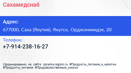 Сахамедснаб по адресу 677000, Саха (Якутия), Якутск, Орджоникидзе, 20 в дальнейшем Организация, размещена в следующих категориях: