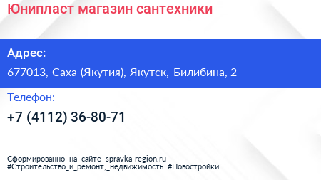 Юнипласт, магазин сантехники по адресу 677013, Саха (Якутия), Якутск, Билибина, 2 в дальнейшем Организация, размещена в следующих категориях: