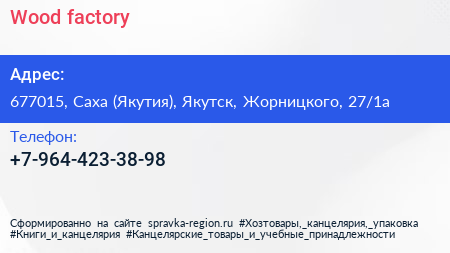 Wood factory по адресу 677015, Саха (Якутия), Якутск, Жорницкого, 27/1а в дальнейшем Организация, размещена в следующих категориях: