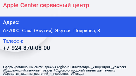 Apple Center, сервисный центр по адресу 677000, Саха (Якутия), Якутск, Пояркова, 8 в дальнейшем Организация, размещена в следующих категориях:
