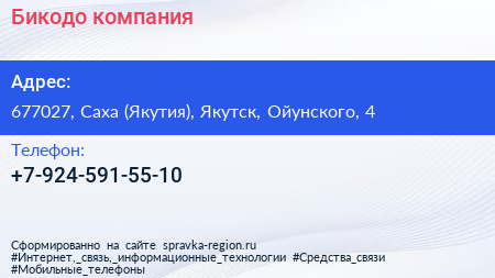 Бикодо, компания по адресу 677027, Саха (Якутия), Якутск, Ойунского, 4 в дальнейшем Организация, размещена в следующих категориях: