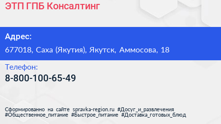 ЭТП ГПБ Консалтинг по адресу 677018, Саха (Якутия), Якутск, Аммосова, 18 в дальнейшем Организация, размещена в следующих категориях: