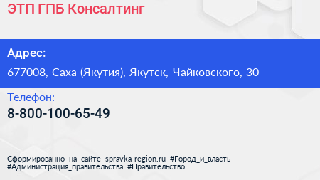ЭТП ГПБ Консалтинг по адресу 677008, Саха (Якутия), Якутск, Чайковского, 30 в дальнейшем Организация, размещена в следующих категориях: