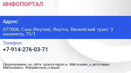 ИНФОПОРТАЛ по адресу 677008, Саха (Якутия), Якутск, Вилюйский тракт 3 километр, 75/1 в дальнейшем Организация, размещена в следующих категориях: