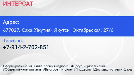ИНТЕРСАТ по адресу 677027, Саха (Якутия), Якутск, Октябрьская, 27/6 в дальнейшем Организация, размещена в следующих категориях: