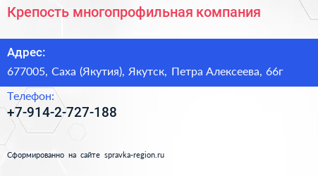 Крепость, многопрофильная компания по адресу 677005, Саха (Якутия), Якутск, Петра Алексеева, 66г в дальнейшем Организация, размещена в следующих категориях: