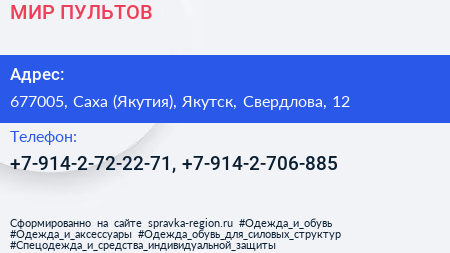 МИР ПУЛЬТОВ по адресу 677005, Саха (Якутия), Якутск, Свердлова, 12 в дальнейшем Организация, размещена в следующих категориях:
