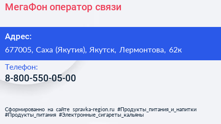 МегаФон, оператор связи по адресу 677005, Саха (Якутия), Якутск, Лермонтова, 62к в дальнейшем Организация, размещена в следующих категориях: