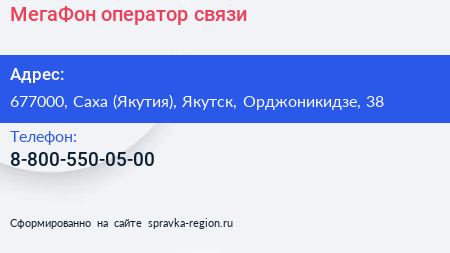 МегаФон, оператор связи по адресу 677000, Саха (Якутия), Якутск, Орджоникидзе, 38 в дальнейшем Организация, размещена в следующих категориях: