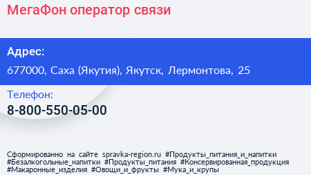 МегаФон, оператор связи по адресу 677000, Саха (Якутия), Якутск, Лермонтова, 25 в дальнейшем Организация, размещена в следующих категориях: