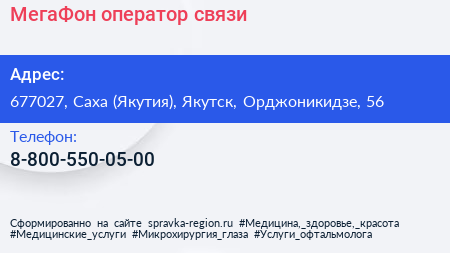 МегаФон, оператор связи по адресу 677027, Саха (Якутия), Якутск, Орджоникидзе, 56 в дальнейшем Организация, размещена в следующих категориях: