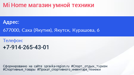 Mi Home, магазин умной техники по адресу 677000, Саха (Якутия), Якутск, Курашова, 6 в дальнейшем Организация, размещена в следующих категориях: