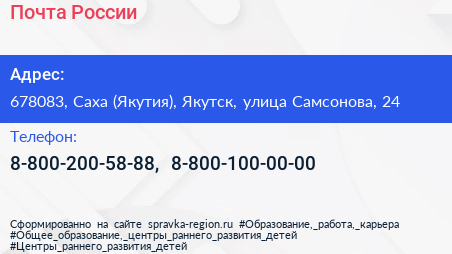 Почта России по адресу 678083, Саха (Якутия), Якутск, улица Самсонова, 24 в дальнейшем Организация, размещена в следующих категориях: