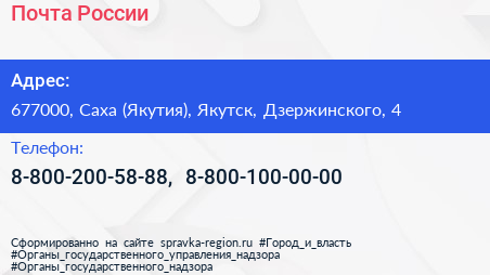 Почта России по адресу 677000, Саха (Якутия), Якутск, Дзержинского, 4 в дальнейшем Организация, размещена в следующих категориях: