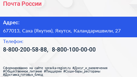 Почта России по адресу 677013, Саха (Якутия), Якутск, Каландаришвили, 27 в дальнейшем Организация, размещена в следующих категориях: