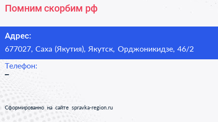 Помним-скорбим.рф по адресу 677027, Саха (Якутия), Якутск, Орджоникидзе, 46/2 в дальнейшем Организация, размещена в следующих категориях: