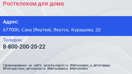Ростелеком для дома по адресу 677000, Саха (Якутия), Якутск, Курашова, 22 в дальнейшем Организация, размещена в следующих категориях: