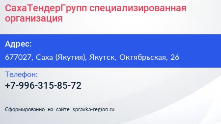 СахаТендерГрупп, специализированная организация по адресу 677027, Саха (Якутия), Якутск, Октябрьская, 26 в дальнейшем Организация, размещена в следующих категориях: