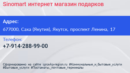 Sinomart, интернет-магазин подарков по адресу 677000, Саха (Якутия), Якутск, проспект Ленина, 17 в дальнейшем Организация, размещена в следующих категориях: