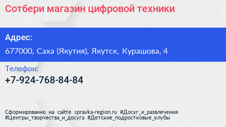 Сотбери, магазин цифровой техники по адресу 677000, Саха (Якутия), Якутск, Курашова, 4 в дальнейшем Организация, размещена в следующих категориях:
