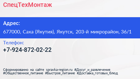 СпецТехМонтаж по адресу 677000, Саха (Якутия), Якутск, 203-й микрорайон, 36/1 в дальнейшем Организация, размещена в следующих категориях: