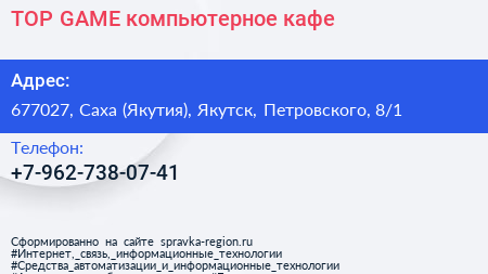 TOP GAME, компьютерное кафе по адресу 677027, Саха (Якутия), Якутск, Петровского, 8/1 в дальнейшем Организация, размещена в следующих категориях: