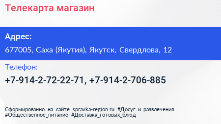 Телекарта, магазин по адресу 677005, Саха (Якутия), Якутск, Свердлова, 12 в дальнейшем Организация, размещена в следующих категориях: