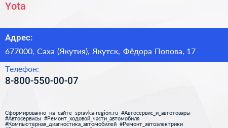 Yota по адресу 677000, Саха (Якутия), Якутск, Фёдора Попова, 17 в дальнейшем Организация, размещена в следующих категориях: