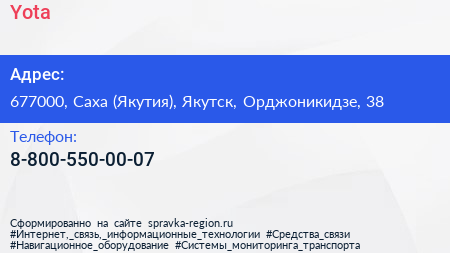Yota по адресу 677000, Саха (Якутия), Якутск, Орджоникидзе, 38 в дальнейшем Организация, размещена в следующих категориях: