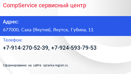 CompService, сервисный центр по адресу 677000, Саха (Якутия), Якутск, Губина, 11 в дальнейшем Организация, размещена в следующих категориях: