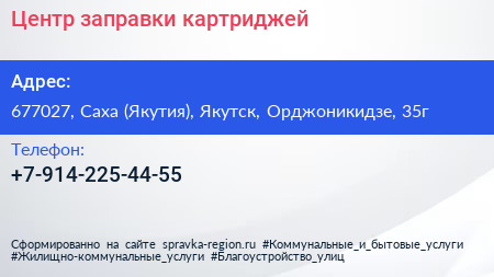 Центр заправки картриджей по адресу 677027, Саха (Якутия), Якутск, Орджоникидзе, 35г в дальнейшем Организация, размещена в следующих категориях: